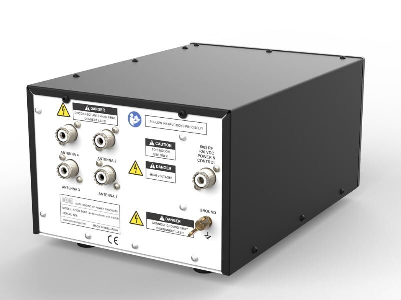 ACOM 06AT is an automatic antenna tuner for HF + 6 m with integrated four-way antenna switch. The tuner automatically selects one of four available antenna outputs (as assigned in bands by the operator) and matches the impedance of the chosen antenna output by transforming it to 50 Ohm with SWR below 1.5:1 at the tuner input (typically below 1.3), providing an optimum load impedance for the amplifier.