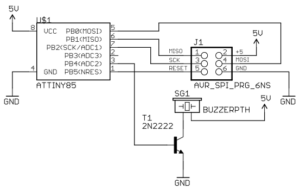 It uses an ATtiny85 ($2.26 at digikey.com) to drive a piezo beeper (? $3.50 at Radio Shack.) The ATtiny85 takes 5.5V max, so I built the circuit on a piece of strip-board so as to fit onto the back of a 3-AA-cell ($3 or so at Radio Shack) battery pack.To program it, I used MIT’s “High-Low Tech” ATtiny85 core using an Arduino as an ISP programmer. I actually built a 6-pin ISP header into the board, so I don’t have to pull the chip out to reprogram it as you would with MIT’s instructions, but that’s neither here nor there. Using an Arduino core allows me to use all the Arduino tools I’m familiar with, but I don’t have to spend $20 or more on a full Arduino when all I really need is one output pin and a couple kb of program space. The ATtiny85 is perfect for this: plenty of memory and dirt cheap. (Actually, an ATtiny25 would work with the amount of memory this program takes, but ATtiny85s are so cheap you don’t save much buying the ATtiny25.)