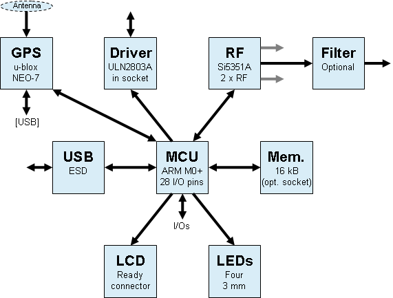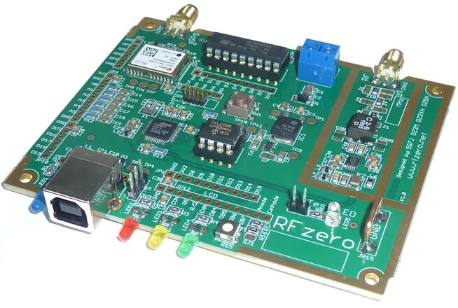The RFzero can generate frequencies from 2605 Hz and beyond 200 MHz. At the same time 28 I/O pins are available and eight of those are via an ULN2803A power driver. The programming and configuration is done via the USB port.