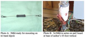 For the resistor, I use the Ohmite Maxi-MoxTM MOX-1-123004F thick-film resistor which is perfect for this application. This resistor is rated at 10KV and 3-megohms, and costs $5.30 in unit quantities. It is readily available from www.mouser.com, Mouser part number 588- MOX-1-123004F. Normally you’ll just need a single resistor, but if you run high power to a highly reactive antenna (like a 43-foot vertical on 160 meters), you might want to put 2-3 of these resistors in series. Photo A shows a single resistor ready for installation on my 20/15/10 meter dipole. Photo B shows three resistors in series, covered with liquid electrical tape, mounted at the base of my 43-foot vertical. Spend a few dollars and stop worrying about damaging your antenna analyzer.