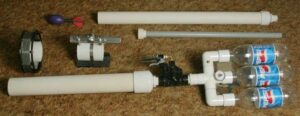 WD6CMU wrote: Field Day 2003 was the testing ground for the third generation tennis ball launcher, dubbed “Trident”. Two legs and the apex of a 400′ vee beam were hoisted with three shots, a fourth shot was used to pull a messenger line over the beam to pull it loose from tree snags — a 100% performance record on its first try out. The 5lb Trident also proved to be handy in the field, easily packed through waist high brush that would have been almost impossible for the previous model which weighed almost 22lb.