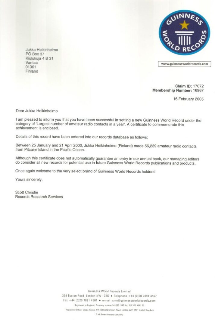 Jukka, OH2BR, made a world record acknowledged by Guinness World Records by making 56,239 QSOs as VP6BR from Pitcairn island during his almost three-month stay on the island in 2005. This is more than any amateur has ever made before from one location with one call-sign in a year. Dick Spenceley, KV4AA, made 48,100 QSOs in 1978.