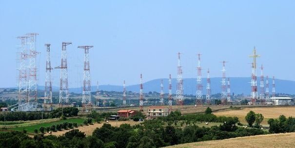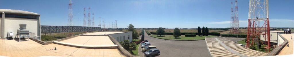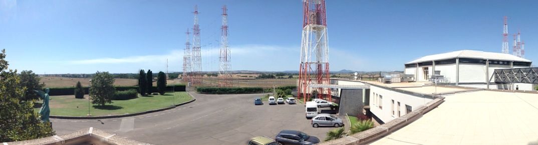 The amateur radio station HV50VR is a special callsign to celebrate the 50th anniversary of Vatican Radio Trasmitting Site “Santa Maria di Galeria”. The Santa Maria di Galeria Transmitter was established in 1957 and it is an extraterritorial area in Italy belonging to the Vatican City. The most interesting aerial is the one for the medium wave frequency 1530 kHz, which consists of four 94 metre high grounded free standing towers arranged in a square, which carry wires for a medium wave aerial on horizontal crossbars. The direction of this aerial can be changed.