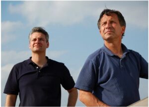 Carl Young (left) met Tim Samaras, WJ0G (right), while attending a meteorological conference. Samaras encouraged Young to collect meteorological data from inside tornadoes as the principal focus of his thesis research. Since spring 2003, Samaras and Young have tracked down more than 125 tornadoes. [Photo courtesy of The Discovery Channel]