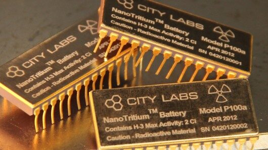 According to the Environmental Protection Agency, tritium has a half-life of 12.3 years and the Model P100a NanoTritium betavoltaic power source from Toronto’s City Labs is claimed to be capable of providing juice to low-power micro-electronic and sensor applications for over 20 years. It’s described as robust and hermetically sealed, and the tritium is incorporated in solid form.