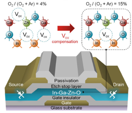 * “To form a Schottky contact at the source/drain contact of the IGZO TFT, we decreased the electron concentration of the IGZO film by using a high oxygen-gas partial pressure against argon gas, i.e., Pox=O/(O2+ Ar), during the RF sputtering process, with subsequent thermal annealing for a more reliable contact.” — Sungsik Lee and Arokia Nathan/Science
