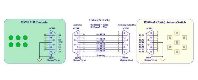 The antenna cable and the coax cable to the station are brought together at the actual “switch”. This separate box can be stored away from the work area, e.g. in the loft or in an adjoining room. This significantly reduces cable clutter in the shack. The controller and switch are connected to each other using a control cable of any length (not included). 9-pin Sub-D sockets are available on both housings for this purpose; the plugs required for this are supplied.