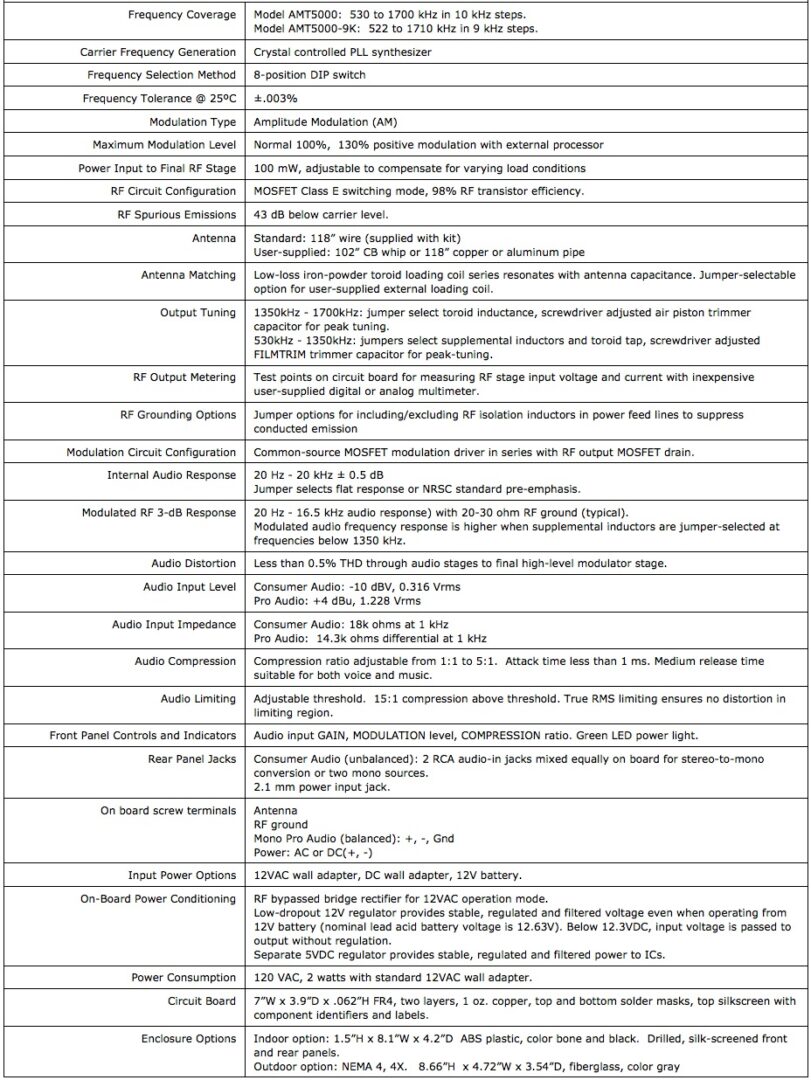 The AMT5000 AM transmitter kit is an FCC Part 15 compliant transmitter designed specifically for high efficiency to provide nearly the highest RF output level practical for any 100 mW transmitter.