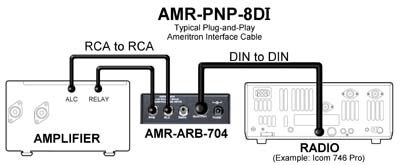 The wiring and setup of the ARB-704 is very simple. The device has both, RCA (Cinch) sockets and a 5pin DIN socket for ready-made cables (see below). The RCA sockets are used with standard RCA cable for PTT from TRx to ARB-704 and on to the amplifier. If ALC is used this connections bypasses the ARB-704, TRx and PA are connected directly on the ALC line.