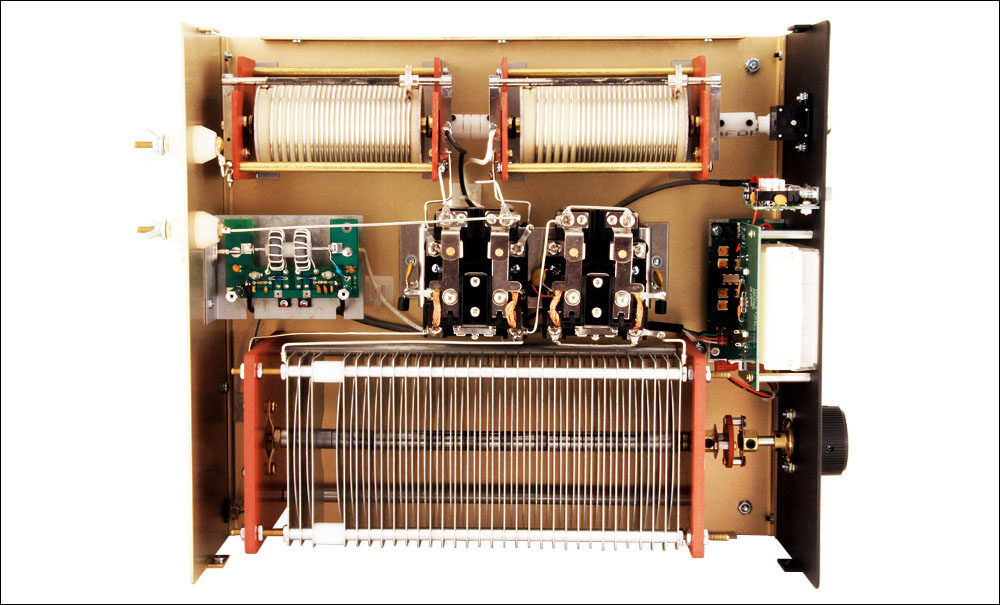 The Palstar BT1500A with two roller inductors on one shaft and a variable capacitor with two sections is designed to be truly balanced. This makes a nearly perfect adjustment for open wire fed antennas possible (also with high power rating). The variable capacitor can be switched either to the input or output side. When the variocap is on the input side it provides a low Z and high-pass filter, when on the output side a high Z and low-pass filter. This offers various impedance ranges for different antennas and applications, making the tuner more versatile.