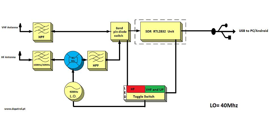 The DX-Patrol is a Software Defined Radio (SDR) receiver with a very wide receiving frequency range. In contrast to the usual cheap USB DVB-T sticks this receiver has an additional converter for shortwave. This is the reason for the wide frequency range from 100 kHz to 2000MHz. For operation with the HF converter additional bandfilters are provided, resulting in a much better dynamic range and good strong signal handling performance.