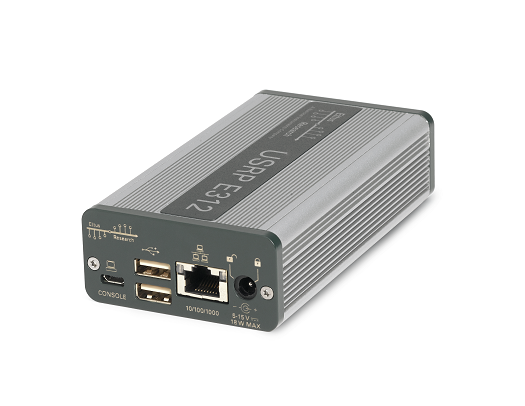 The baseband processor uses the Xilinx Zynq 7020 SoC to deliver FPGA accelerated computations combined with stand-alone operation enabled by a dual-core ARM CPU. The USRP E312 includes a rich set of peripherals such as an integrated GPS receiver for position awareness and time sychronization, as well as two host USB ports for extending storage, I/O, and communication options with off-the-shelf devices. Users can rapidly prototype and deploy designs for mobile and embedded applications with tight size, weight, and power requirements.