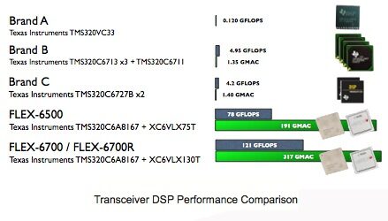 The FLEX-6000 Signature Series packs more built-in digital signal process power than ever before imagined in an amateur radio transceiver. The FLEX-6700 and FLEX-6700R weighs in at a massive 317 billion multiply-accumulate operations per second (GMACs) and 121 billion floating point operations per second (GFLOPS). The FLEX-6500 delivers 191 GMACs and 78 GFLOPS. This level of performance allows the FLEX- 6000 Signature Series to become a platform for amateur radio communication applications that were never before considered.