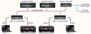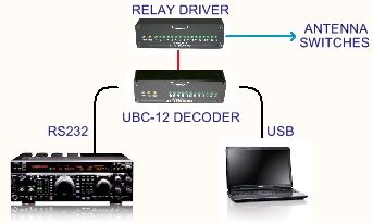 As in the above example, an RS-232 or Icom CI/V to USB interface is built-in. The same configuration can be easily expanded to a two radio setup by simply adding another UBC-12 Band Decoder as shown below. In addition, bandpass filters are usually required for two radio operation.