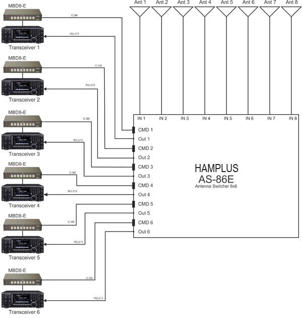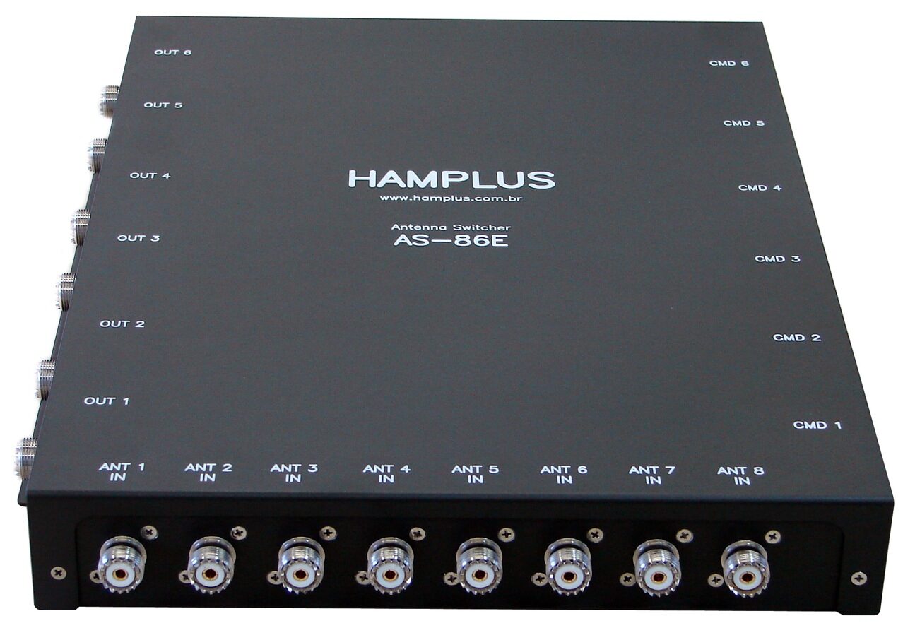 The switcher AS-86e receives the signals from eight antennas selecting one of them for each radio (six of then), leaving the others not in use, shorted to ground. In the case of power supply disconnection, the radios became free and all antennas are grounded.