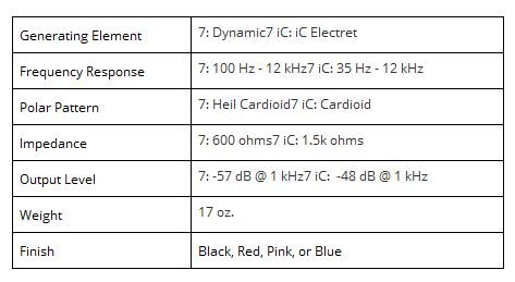 The PRO 7 has interchangeable microphone system allows the microphone element to be easily changed in the field for different types of applications. The low distortion Dynamic HC-7 element exhibits a frequency response of 100 Hz – 12 kHz with the -3dB points at 100 Hz and 12 kHz. The traditional Heil speech articulation rise is centered at 2K -4KHz with properly balanced highs and lows. The impedance is 600 ohm. The HC-7 is one of our best microphone elements for speech articulation.