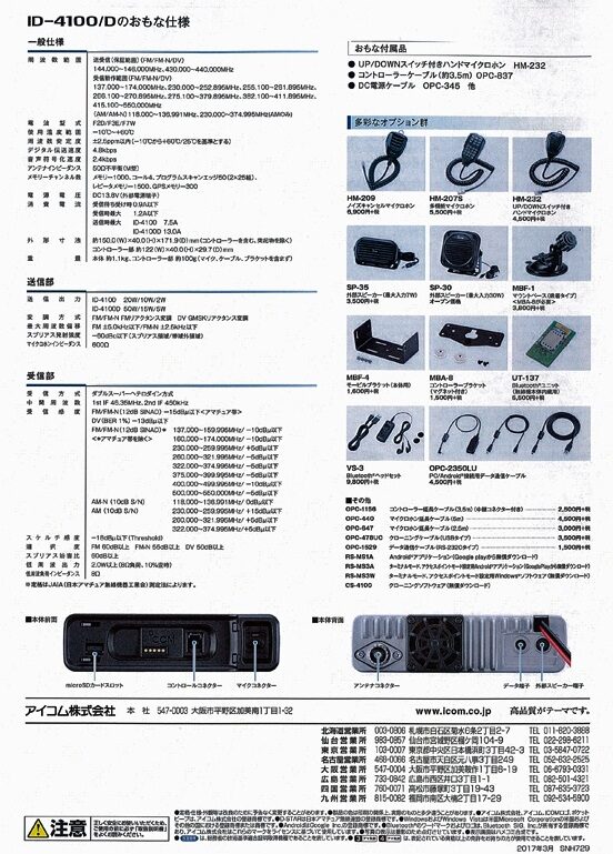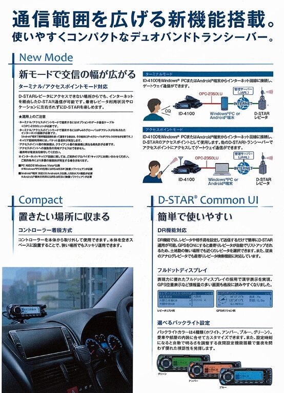 Enter the next generation of Digital Radio with the Icom ID-4100A 144/430 dual band 50 watt mobile. The full Dot-Matrix Display has easy-to-read characters and icons. There is a built-in GPS. The DR (D-STAR® Repeater) function is supported with the latest Icom user-interface. The exciting Terminal & Access Point Mode extends D-STAR coverage with the Internet (optional data cable and free-download application required. Hands-free Bluetooth® operation is possible with optional Bluetooth® unit and headset. Optional enhanced remote control apps will be available (will require Bluetooth® options). The ID-4100A has a compact, detachable head-controller for flexible installation.