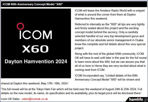 Icom Co., Ltd. held the world’s largest amateur radio event “Hamvention”, which opened in Genia City, Ohio, U.S., at 9:30 a.m. on May 17, 2024 (Japan time: 10:30 p.m. May 17, 2024). At the 2024 event, the company announced the amateur radio concept model “X60” to commemorate the company’s 60th anniversary. This time, only the main boards and units of the X60 were on display, and the staff did not reveal any details, only saying, “Please look forward to the Icom booth at Ham Fair 2024, which will be held in Tokyo in August 2024.” .
