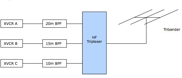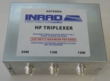 Note that the Inrad HF Triplexer is designed to work into a triband antenna which is tuned and simultaneously has low VSWR in each of the three bands (10, 15 and 20m). It is not meant for use with a non-resonant antenna which needs a tuner to operate. Examples of antennas that are not usable with the triplexer are Steppirs, G5RV, monoband dipoles, non-resonant verticals, etc. Tribanders such as the TH6DXX, KT34XA, A3S, C-3, CL 33, OB16-3, Skyhawk, Hexbeam and similar antennas should work well.
