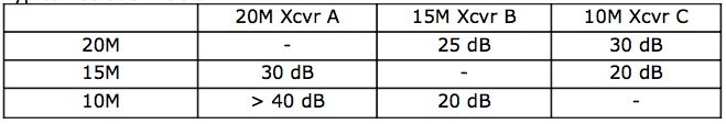 The top row above shows three xcvrs (A, B and C), each operating on a designated band. Xcvr A will receive a signal from Xcvr B which is 30 db down and from Xcvr C which is > 40 dB down, etc.