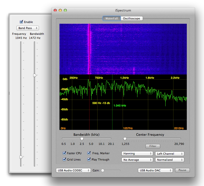 iSpectrum is an easy to use audio spectrum analyzer that allows you to view live audio in a standard frequency plot, a stereo oscilloscope view and a waterfall display. You can adjust the display resolution, center frequency and save images to disk. iSpectrum is used by Amateur Radio Operators, Audiofiles, Musicians, Sound Technicians and Educators.