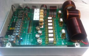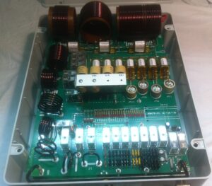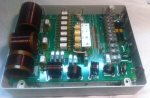 JC-5 was designed to cover the needs of high power professional use and increased reliability. So, materials of the best in market were used, despite the high cost of some of them, due to their limited production! At the pictures you can take a look at the inside of the coupler. In the photos we can see mounted in a row the vacuum relays, by which the high voltage doorknob ceramic capacitors are selected. We can also see the high voltage copper wiring above the p.c. board. The reason we did not construct the high voltage paths on the board is that we don’t consider the p.c. board reliable enough for withstanding voltages of the order of 8 KV that may appear at the output of the coupler when λ/2 or short vertical antennas are used!