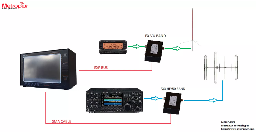 METROPWR FX775, is a modern VECTOR POWER/SWR METER completely digital. It’s composed of a wattmeter and a power coupler for measurements up to 3/5kW. It has a very modern design, and very high performance. It has inside a fast 32bit processor plus a coprocessor to handle all the measurements in real time, and measure Power (AVG, PeP, dBm) , SWR, R, Z, X, and more. It has a fast external bus with which you can connect many accessories in series: