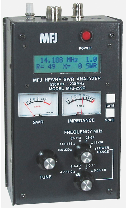 MFJ 259C 530 KHz – 230 MHz SWR Analyzers are compact, battery-powered RF impedance analyzers. They combine four basic circuits; a 0.53-230 MHz variable frequency oscillator, a frequency counter, a 50 ohm RF-bridge, and an 8-bit micro-controller. These analyzers make a wide variety of useful antenna or impedance measurements, including coaxial cable loss and distance to an open or short. Although primarily designed for analyzing 50 ohm antenna and transmission line systems, MFJ 259C HF/VHF SWR analyzers also measure RF impedances between a few ohms and several hundred ohms.