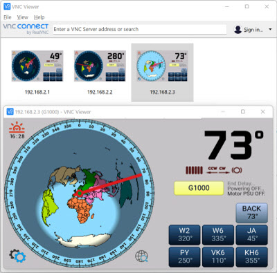 Built-in VNC server provides exact copy of regular ARCO screen on your computer monitor, tablet, or smartphone, enabling full control of antenna rotator and antenna switches driven by ARXC Relay modules directly from the computer or mobile device, regardless if you are connected to ARCO Jr. locally or remotely over Internet.
