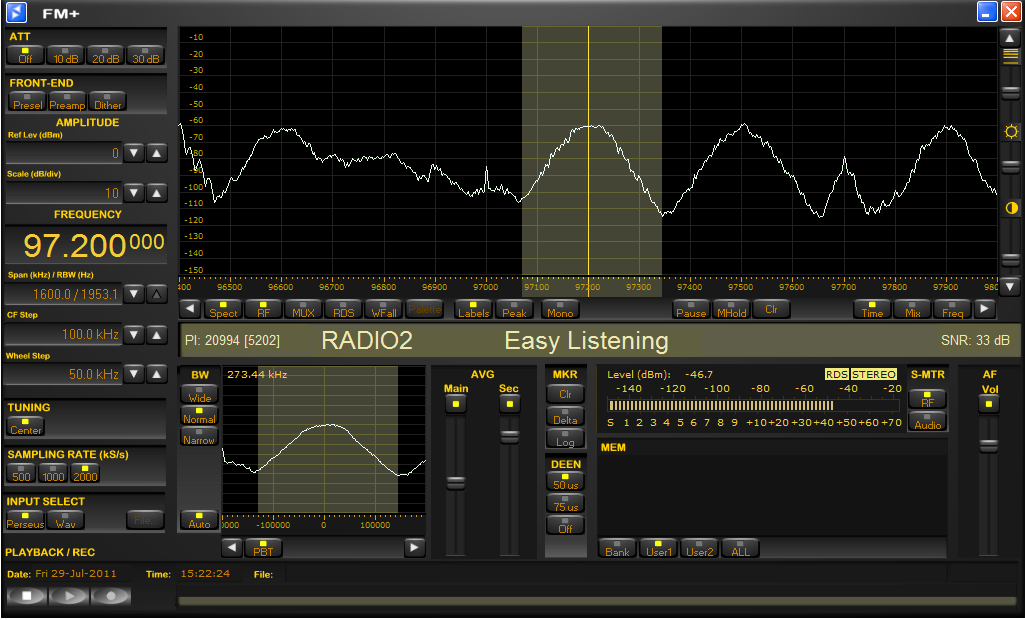 The FM+ Software performs wide band stereo FM demodulation with RDS decoding of the tuned signal with overall features which are similar to the Perseus software application. The selectivity filter operates at 500 kS/s with a maximum IF bandwidth of 400 kHz and can be narrowed down to 20 kHz for FM DX operations. Three spectral views are available: RF (RF spectrum view, like in the Perseus software, MUX (demodulated stereo multiplex) and RDS (showing the RDS signal spectrum if present). Shown RDS informations are station name, program type and PI code.