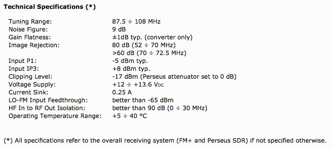 FM+ is a 87.5?108 MHz broadcast band converter expressely designed for the Perseus receiver. It features a very good dynamic range which perfectly matches the Perseus receiver. The converter is equipped with a control software application suited for FM DXers needs. The FM+ is equipped with an internal antenna switch for direct connection to an HF antenna when the converter is not used.