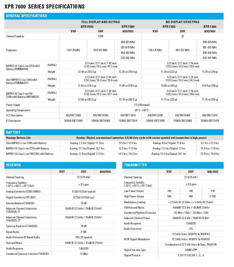 XPR 7000 Series radios meet the most demanding specs, including IP57 for water submersibility and U.S. Military 810 C, D, E, F, & G standards for exceptional durability. The radio is also “intrinsically safe” when purchased and equipped with an intrinsically safe (FM) battery, for use in environments where flammable gas, vapors or  combustible dust may be present. and it’s backed by a two-year Standard Warranty, one-year Repair Service advantage (US)/Extended Warranty (Canada) and minimum  1-year warranty for batteries and accessories.