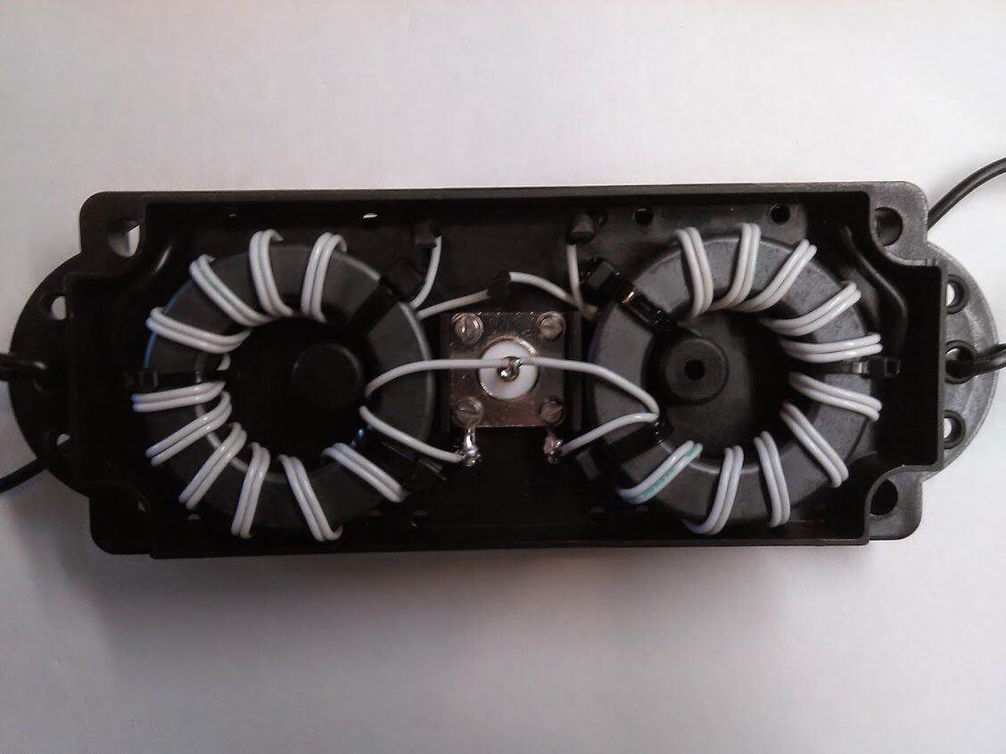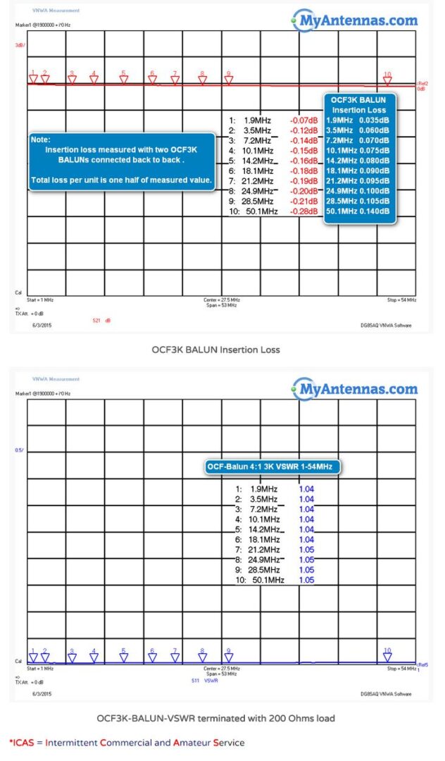 This is OCF antenna also known as Windom antenna fed at 19% of one end. Current type 4:1 (200:50 Ohms) BALUN is another product designed for OCF antennas (Off Center Fed) also known as Windom antenna. Dual cores, total of two (2) 2.4 inch (61mm) wound with PTFE wire is the best CURRENT BALUN design used with unbalanced antennas. It covers 1-54 MHz with almost perfect VSWR terminated into 200 Ohms load, see the VSWR curve at the gallery. Unlike other companies, we do not claim unrealistic power ratings. We are sure it will handle all you have up to legal limit of 1500W in US and even more. It is rated at 3kW ICAS.