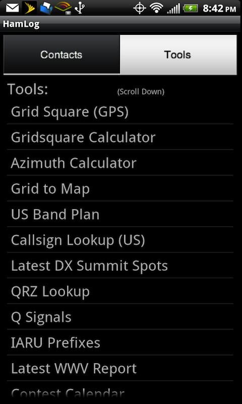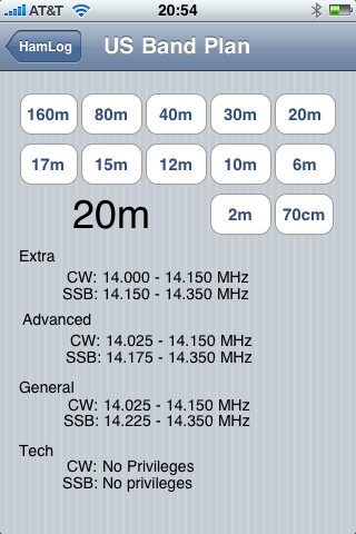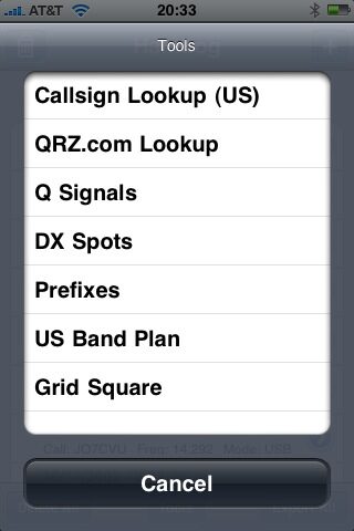 * iTunes File Sharing – For data backup and ADIF import – Drop somelogfile.adi into the file sharing pane and press Tools -> Import ADIF. somelogfile.adi should be lowercase until I get an update to recognize uppercase filenames.