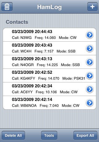 HamLog is an amateur radio logging application. It maintains past contacts in chronological order giving the user the ability to quickly add new and edit existing contacts. It is meant for use when operating portable from the field or mobile (drive safe!). It supports automatic name and QTH lookup via 3G or WLAN and supports exporting contacts via email as CSV, as ADIF over WLAN, to your favorite computer based logging program. You can also do bulk export directly to eQSL.cc. HamLog supports iPhone, iPod Touch and iPad.Features: