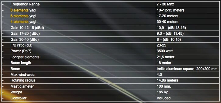 UB-1040 DX Features :UB-1040 DX is equivalent to seven monoband. Eight elements operate on the 10-12-15 meter-bands, six elements on 17-20 and four elements for the 30 and 40 meters bands.