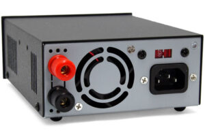This small regulated switching power supply features 2 Powerpole outputs in front and 1/4″ binding posts in rear. Machined metal front bezel with illuminated power switch. DC output voltage 14.1V at 25A continuous, 30A surge. Small 6x5x2.5″ footprint.