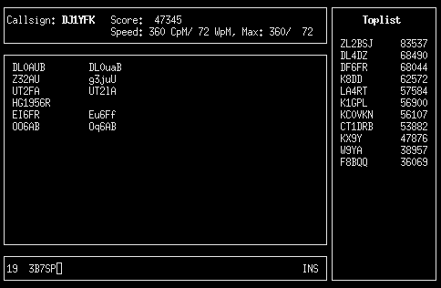 Using qrq is simple: qrq sends 50 random calls from a database. After each call, it waits for the user to enter what he heard and compares the entered callsign with the one sent. If the callsign is copied correctly, the speed is increased by 10cpm / 2wpm and full points are credited, if there were mistakes in the callsign entered, the speed decreases by 10cpm / 2wpm and (depending on how many letters were correct) only a fraction of the maximum points are credited.
