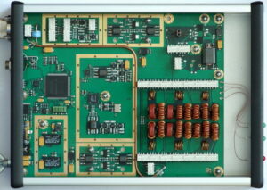 High-performance FPGA is used for digital down conversion, passband forming and communication with PC.