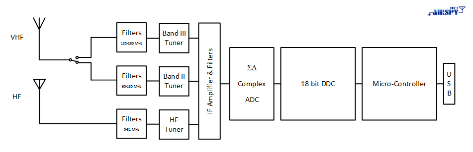 Airspy HF+ achieves excellent HF performance by mean of a low-loss band filter, a high linearity LNA, a high linearity tunable RF filter, an over-tone-rejection (OTR) mixer that rejects up to the 21st harmonic and an IF filter.