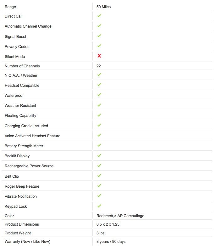 The Uniden GMR5099-2CKHS 2-way radio is a lightweight, rugged and state of the art device loaded with valuable features and accessories, including submersible housing, Realtree™ AP camouflage casing, 2 VOX Headsets and 2 carabiner clips. Use it at sporting events, to stay in contact with family and friends, hiking, skiing, outdoors, or in a neighborhood watch for vital communication.