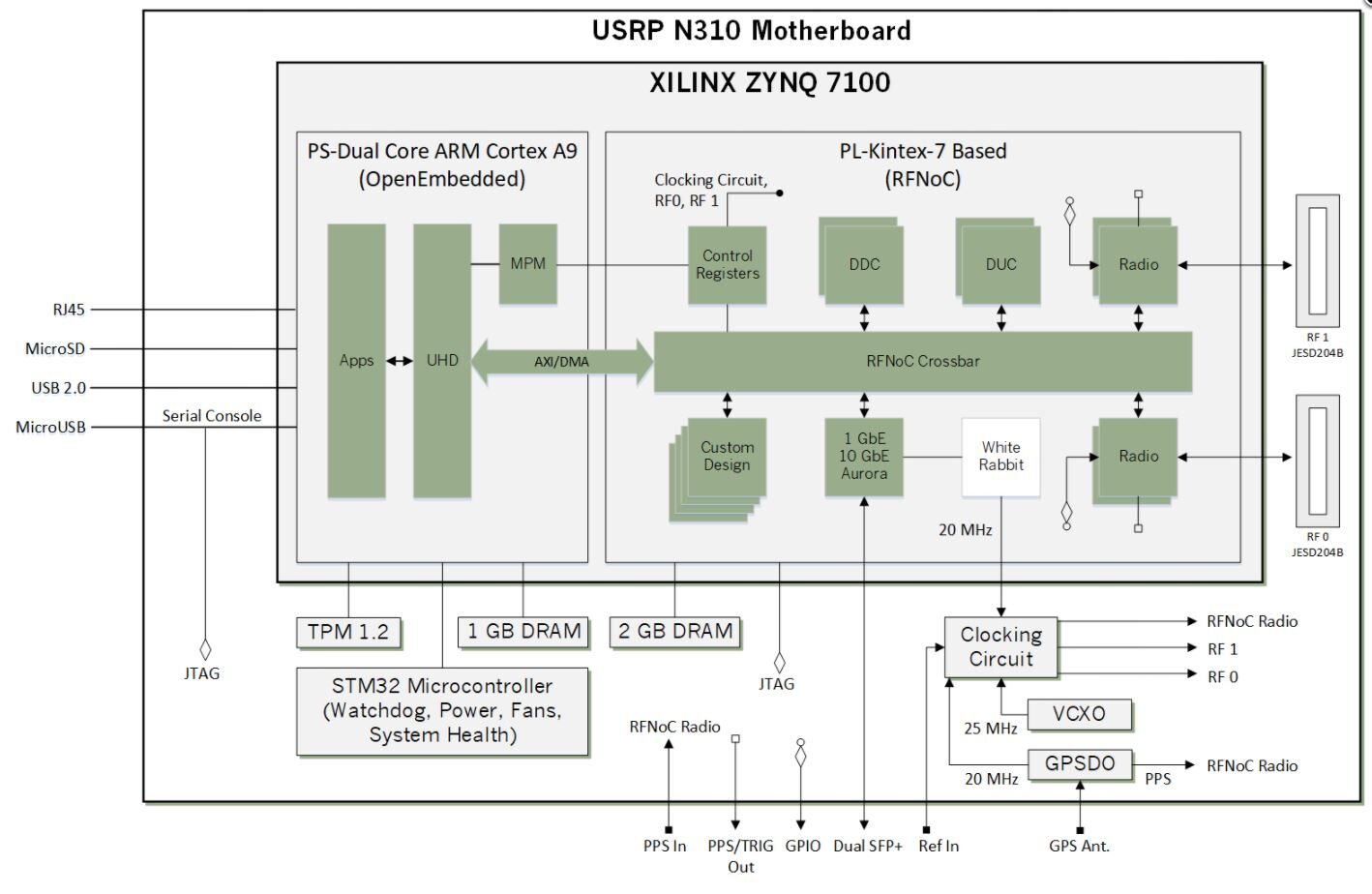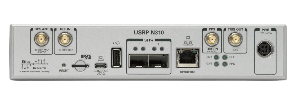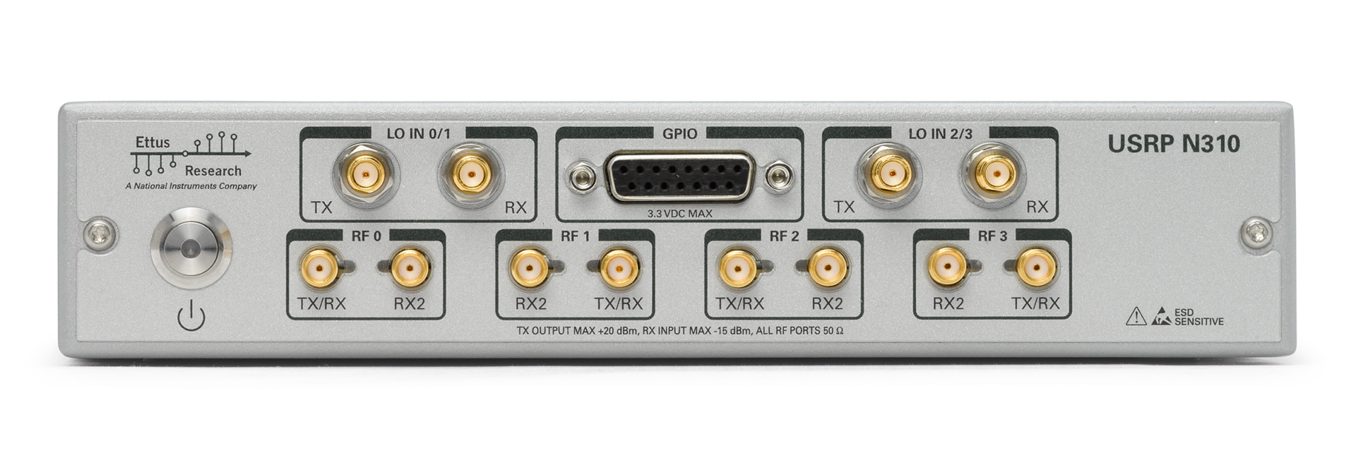 The USRP N310 is a networked software defined radio (SDR) that provides reliability and fault-tolerance for deployment in large-scale and distributed wireless systems. The USRP N310 device simplifies control and management of a network of radios by introducing the unique capability to remotely perform tasks such as updating software, rebooting, factory resetting, self-testing, host PC/ARM debugging and monitoring system health.