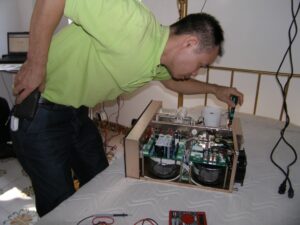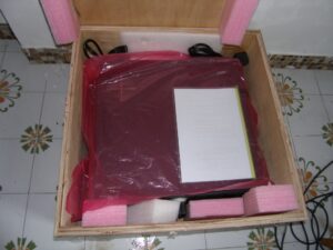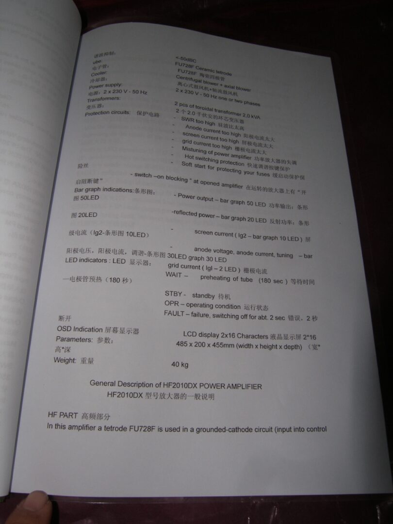 Pictures of the amplifier unit, with images of the accompanying manual pages are provided. The unit is packaged in a plywood crate and can withstand long-distance shipping. There was a minor glitch just before the contest.