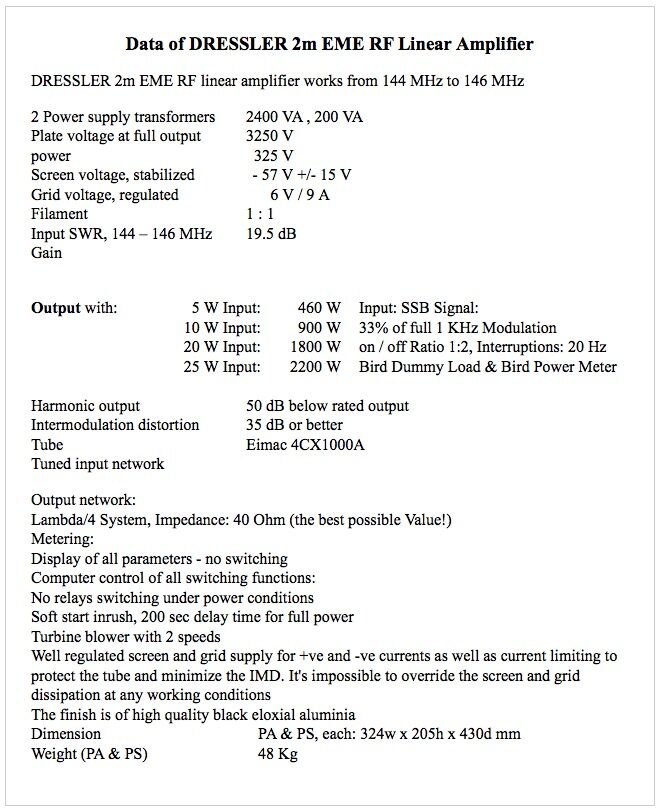 DRESSLER 2m EME RF linear amplifier works from 144 MHz to 146 MHz Link Category: QRO/QRPOctober 12, 2011Tags: EMELinear amplifierPAVHFPost navigationPreviousPrevious post:World Radio DayNextNext post:HA1YA’s RF Linear Amplifier ME1200H