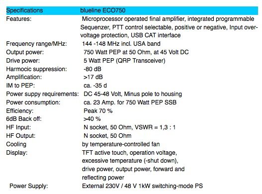 The type of “BlueLine Eco750” for 2m, available from Q4/2011 to SSB-Electronic in Lippstadt, operates on the Doherty principle with up to 20% higher efficiency at medium controls in SSB mode. The power amplifier designed for portable use, but also shows particularly in long-term use its strengths.