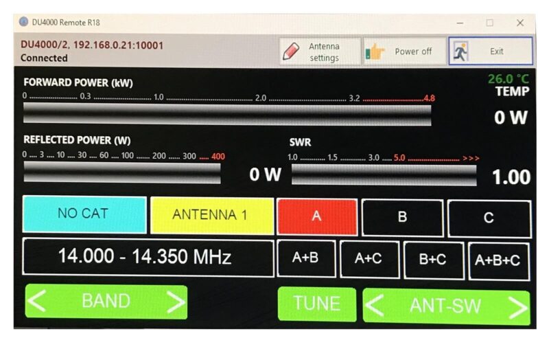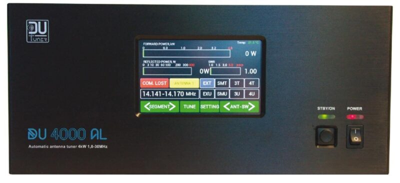 HA8DU DU4000AL Automatic Antenna Tuners offer advanced automation and display features that are truly unique for a 4kW HF antenna tuner, making this unit the modern-day station command center for automatic band, antenna, and memorized tuning selections. An intuitive 5-color, 5 in. touch screen provides complete control, status, and metering functionality for all station operations, including frequency readout, Forward and Reverse Power and SWR, multiple electronically variable Capacitors “TUNE”, and an electronic 11- position Inductor “SWITCH” selector. The DU4000AL also features complete tuning memorization of four rear panel antenna ports as well as direct voltage control of an External 8-port Antenna Switch and Stack Match Switching. It interfaces with all types of Amateur transceivers, with the capability to use an RS-232 interface in-line between specific Yaesu, Kenwood, or Elecraft transceivers and the PC. Or, use this tuner’s direct Icom “Remote” CI-V input while connecting the transceiver to the PC by USB. To top it off, the DU4000AL can be operated remotely over the Internet via LAN-Ethernet, supported by a Windows application.