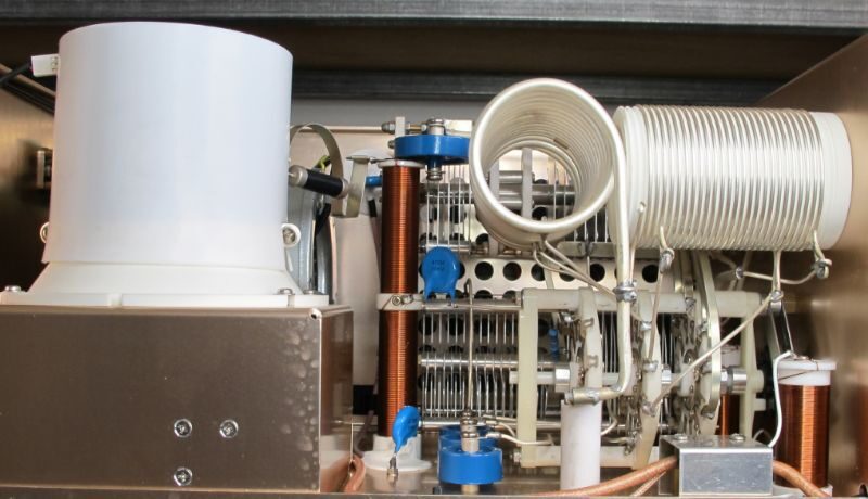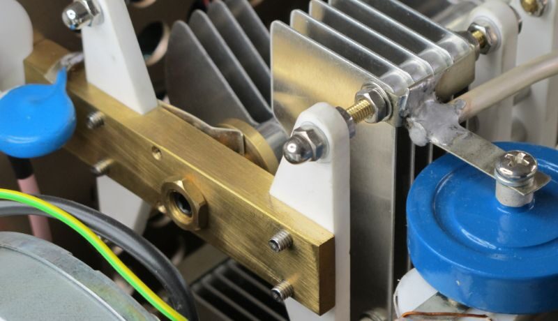 The output of the amplifier is a Pi-L circuit. The ceramic capacitor for TUNE and LOAD are divided. This enables the amplifier to be tuned exactly and makes it possible to easily return to the previously set positions after band change.